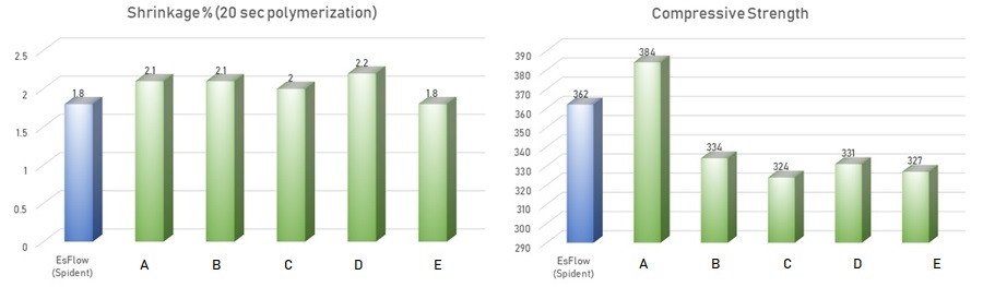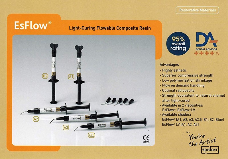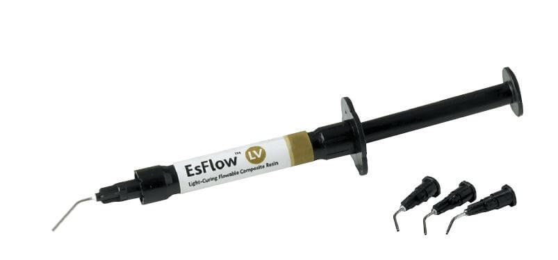 EsFlow® is light-cured nano-hybrid flowable composite resin. It offers two viscosity, medium and low. It also has blue shade which can be used for core build up.